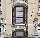 His use of sculpture has been linked to the legacy of Stroganov Institute school that focused on elaborate facade decorations.[3] However, none of contemporary architects used sculpture so frequently and on such scale as Zherikhov. His best known work, a small 4-story apartment building on the corner of Plotnikov and Maly Mogiltsevsky Lane, completed in 1907, features a band of 40 life-sized figures arranged in groups of two or three in explicitly erotic settings.[4] Three of the satyrs resemble Leo Tolstoy, Alexander Pushkin and Nikolay Gogol.[4] The name of the sculptor has been lost; perhaps it was Leeb Sinayev, author of Pushkin Museum friezes, or one of his disciples.[3] Tourist guides say that the building once housed a high-class brothel,[4] but the statement is refuted by historians as an urban legend.[3]