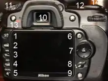 From the camera's rear, the Nikon D90 interface has the following features which are annotated in the image.[41]