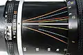 Close up of Nikon 80-200 f/4 zoom lens showing the color-coded depth-of-field lines