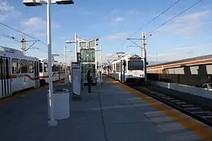 Nine Mile station is an island platformed RTD light rail station in Aurora, Colorado, United States. The station was opened on November 17, 2006, and is operated by the Regional Transportation District as part of the H and R lines.[4][5] When it opened in 2006, it was the terminus of the H Line Southeast Corridor trains traveling along Interstate 225.[6] After the opening of the R Line in 2017, trains on the H Line were extended northeast to Florida station.