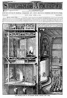 On February 7, 1880, the Spirit of the Times announced: "Tonight Mr. J. Steele MacKaye will open the most exquisite theatre in the world, and all New York will assemble to do honor to the realization of his artistic visions…Mr. MacKaye will play the drama Hazel Kirke through with only two-minute waits between the acts, and will then exhibit the double stage—one compartment set for the kitchen of Blackburn Mill and other as boudoir at Fairy Grove Villa." MacKaye’s elevator stage was an important development of American drama and theatre. It was a solution to the problem posed by the increasing use of box sets to reproduce interior scenes in detail. With the elevator stage, multiple scenes could be changed in a fast and detailed way. This greatly improved the speed and efficiency of scenic changes, and design didn’t have to be simplified; it could still be detailed. The elevator stage was described in Scientific American, April 5, 1884. "[It consists] of two theatrical stages, one above another, to be moved up and down as an elevator car is operated in a high building, and so that either one of them can easily and quickly be at any time brought to the proper level for acting thereon in front of the auditorium. While the play is proceeding before the audience, the assistants arrange another scene on the upper stage."[12]