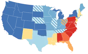 Carrie Chapman Catt and Alice Paul immediately mobilized members of the NAWSA and NWP to pressure states to ratify the amendment. Within a few days, Wisconsin, Illinois, and Michigan did so, their legislatures being in session. It is arguable which State was considered first to ratify the amendment. While Illinois's legislature passed the legislation an hour prior to Wisconsin, Wisconsin's delegate, David James, arrived earlier and was presented with a statement establishing Wisconsin as the first to ratify.[57] By August 2, fourteen states had approved ratification, and by the end of 1919 twenty-two had ratified the amendment.[53] In other states support proved more difficult to secure. Much of the opposition to the amendment came from Southern Democrats; only two former Confederate states (Texas and Arkansas) and three border states voted for ratification,[42] with Kentucky and West Virginia not doing so until 1920. Alabama and Georgia were the first states to defeat ratification. The governor of Louisiana worked to organize 13 states to resist ratifying the amendment. The Maryland legislature refused to ratify the amendment and attempted to prevent other states from doing so. Carrie Catt began appealing to Western governors, encouraging them to act swiftly. By the end of 1919, a total of 22 states had ratified the amendment.[53]