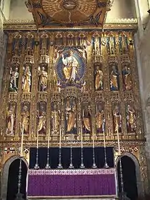 Comper is noted for continuing the tradition of designing altars in a medieval fashion, known as the 'English altar', which was first re-introduced by A.W. Pugin. An 'English altar' is an altar surrounded by riddel posts, from which riddel curtains hang, contemporary creations of which sometimes include a gradine, and despite its name, it is found in not just Medieval England, but other parts of Europe as well, including France and Italy. Comper designed a number of remarkable altar screens (reredos), inspired by medieval originals. Wymondham Abbey, Norfolk, has one example.[6] He was also capable of innovative planning; his Church of St Mary-in-the-Baum, Rochdale responds to a restricted urban site by placing the "sensationally high"[7] nave on the well-lit southern side of the building, with the aisle on the north side.[8]