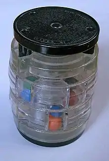 The Nintendo tumbler puzzle, also known as the Ten Billion Barrel in English and originally tenbirion (テンビリオン) in Japanese, is a mathematical puzzle in the style of Rubik's Cube. It was invented by Gunpei Yokoi of Nintendo in 1980 and was covered by U.S. Patent 4,376,537 until the patent expired in March 1995 due to non-payment of a maintenance fee.
