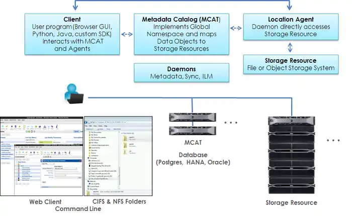 Nirvana is client-server software composed of Location Agents that reside on, or access, Storage Resources. A Storage Resource can be a networked-attached storage (NAS) system, object storage system or cloud storage service. Nirvana catalogs the location of the files and objects in these storage resources into its Metadata Catalog (MCAT) and tags the files with storage system metadata (Owner, File Name, File Size and Creation, Change, Modification and Access Timestamps) and additional user-defined, domain specific metadata. System and user-defined metadata can be used to search for a file or object (or groups of files and objects) and also control access to and move those files and objects from one storage resource to another. The MCAT creates a single Global Namespace across all Storage Resources connected to it so users and administrators can search for, access, and move data across multiple heterogeneous storage systems from multiple vendors across geographically dispersed data centers. The MCAT is connected to and interacts with a relational database management system to support its operation. Multiple MCATs can be deployed for horizontal scale-out and failover. Various Clients can interact with Nirvana including the supplied Web browser and Java based GUI Clients, a Command Line Interface, a native Windows virtual network drive interface, and user-developed applications via supplied APIs.