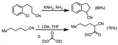 Examples of arylation and acylation reactions are shown below. Although intermolecular arylations using nitrile anions result in modest yields, the intramolecular procedure efficiently gives four-, five-, and six-membered benzo-fused rings. Acylation can be accomplished using a wide variety of acyl electrophiles, including carbonates, chloroformates, esters, anyhdrides, and acid chlorides.[11] In these reactions, two equivalents of base are used to drive the reaction towards acylated product—the acylated product is more acidic than the starting material.
