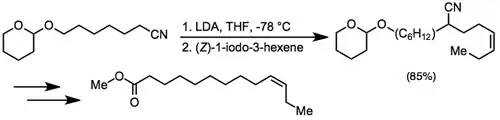Alkylation of a nitrile anion followed by reductive decyanation was employed in the novel synthesis of (Z)-9-dodecen-1-yl acetate, the sex pheromone of Paralobesia viteana.[12]