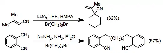 Polyanions of nitriles can also be generated by multiple deprotonations, and these species produce polyalkylated products in the presence of alkyl electrophiles.[2]
