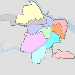 The Lower City (Russian: Заречная часть, Zarechnaya chast, Over river part) occupies the low (western) side of the Oka, and includes five city districts: