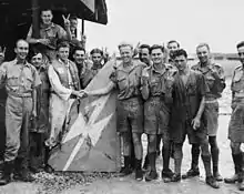 Possibly the top scoring 488 Squadron Mosquito of the war was NF.Mk.XII MM466, ME-R, which shot down seven enemy aircraft between July 1944 and November 1944, after which the aircraft was passed on to 409 Sqn., with which it shot down another four.[13] In its night fighter incarnation, 488 Squadron flew 2899 sorties, shot down 67 aircraft and, in its intruder role, destroyed 40 trains.[14] In one notable sortie in July 1944, Flight Lieutenant George Jameson and his radar operator Norman Crookes shot down four enemy aircraft.[15] Pilots of the squadron were awarded 5 DFCs, a DSO and an AFC.[14]