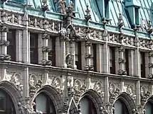 Along Broadway, the Townsend (1896) and St. James (1896) were the tallest buildings in New York for a short while, and remain historic landmarks. Slightly up the street, the Baudouine Building at 28th Street was heavily decorated with escutcheons of anthemions with lion heads over many windows. At the same corner, the Johnston Building (now the Hotel NoMad) was built in 1900 and faced in all limestone with beautiful exterior decoration. One block up, Jacqueline Kennedy Onassis’s grandfather built a classically designed loft building, next to the Breslin.[31]