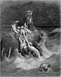 Similarly, Rabbi Jose of Caesarea read the words, "He is swift upon the face of the waters; their portion is cursed in the earth, he turns not by the way of the vineyards," in Job 24:18 to teach that the righteous Noah rebuked his contemporaries. Noah urged them to repent, or God would bring a deluge upon them and cause their bodies to float upon the water like gourds, reading Job 24:18 to say, "He floats lightly upon the face of the waters." Moreover, Noah told them that they would be taken as a curse for all future generations, as Job 24:18 says, "their portion is cursed." And Rabbi Jose of Caesarea taught that the words, "he turns not by the way of the vineyards," indicate that as the people worked in their vineyards, they asked Noah what prevented God from bringing the Flood at that moment. And Noah replied that God had one dear one, one dove, to draw out before God could bring the Flood. (That is, the aged Methuselah had to die first, so that he would not suffer the punishment of the Flood).[83]
