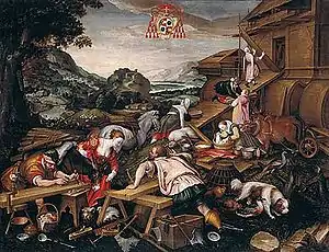 In the sixth reading (עליה, aliyah), Noah became the first to plant a vineyard, and he drank himself drunk, and was uncovered within his tent.[36] Ham, the father of Canaan, saw his father's nakedness and told his two brothers.[37] Shem and Japheth placed a cloth against both their backs and, walking backward, covered their father, without seeing their father's nakedness.[38] When Noah woke up and learned what Ham had done to him, he cursed Ham's son Canaan to become the lowest of slaves to Japheth and Shem, prayed that God enlarge Japheth, and blessed the God of Shem.[39] Noah lived to the age of 950 and then died.[40] The second open portion (פתוחה, petuchah) ends here.[41]