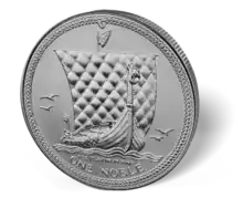 Reverse: shows a viking ship and four birds with the denomination. In small lettering beneath the ship, metal content, coin size and fineness are given. The design is framed by an elaborate Viking knit motif border with the island's coat of arms, the triskele, appearing at the top, above the ship's flag.