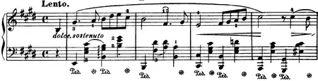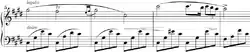 Chopin's nocturnes carry many similarities with those of Field while at the same time retaining a distinct, unique sound of their own. One aspect of the nocturne that Chopin continued from Field is the use of a song-like melody in the right hand. This is one of the most if not the most important features to the nocturne as a whole. The use of the melody as vocals bestowed a greater emotional depth to the piece, drawing the listener in to a greater extent.[3] Along with the right-hand melody, Chopin continued the use of another nocturne "necessity", that of playing broken chords on the left hand to act as the rhythm under his right-handed "vocal" melody. Another technique used by Field and continued by Chopin was the more extensive use of the pedal. By using the pedal more, the music gains more emotional expression through sustained notes, giving the piece an aura of drama.[7] With these main attributes of the "Field nocturne" Chopin was inspired, and expanded upon them to develop the "Chopin nocturne".