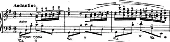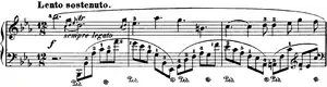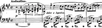 One of the greatest innovations made by Chopin to the nocturne was his use of a more freely flowing rhythm, a technique based on the classical music style. Also, Chopin further developed the structure of the nocturne, taking inspiration from the Italian and French opera arias, as well as the sonata form. Composer Franz Liszt even insisted that Chopin's nocturnes were influenced by Vincenzo Bellini's bel canto arias,[8] a statement affirmed and echoed by many in the music world. A further innovation of Chopin's was his use of counterpoint to create tension in the nocturnes, a method that even further expanded the dramatic tone and feel of the piece itself.[3] It was mainly through these themes of operatic influence, freer rhythms, and an expansion into more complex structures and melodic playing that Chopin made his mark on the nocturne.[7] Many think of the "Chopin nocturne" as a mix between the form and structure of Field and the sound of Mozart, displaying a classic/romantic-influenced theme within the music.[3]