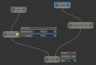 The use of node graph architecture in software design is especially popular in the film and video game industries. The diagram above shows a simplified user interface for an artistic tool for editing and creating videos. The nodes are represented as rectangles and are connected to each other through curved lines (Bézier curves). In this software's operational model, a video sequence is being passed through the lines onto the next node, and each node performs some additional modifications to the video sequence. In this example one video is translated in 2D, another is pixelated, and finally, both streams are merged.