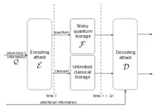 The assumption of the noisy-storage model is that during waiting times introduced into the protocol, the adversary can only store quantum information in his noisy memory device.[11] Such a device is simply a quantum channel that takes input states to some noisy output states . Otherwise, the adversary is all powerful. For example, he can store an unlimited amount of classical information and perform any computation instantaneously.
