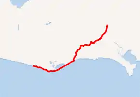 The Nome–Council Highway begins at a T intersection with Nome Bypass Road and Front Street; the former route travels north from the intersection and forms a partial loop around the main built-up area of Nome, while the latter extends westward from the intersection along the Nome seawall into the city. The highway travels southeastward from this intersection, parallel to the Bering Sea. For the first mile, the route passes East End Park Ponds to the north, a city park which contains the Swanberg Dredge and is an important point for bird migration.[2][3] After approximately 1.3 miles (2.1 km), the highway intersects Kougarok Road, another state highway, which travels 85 miles (137 km) northward to the Kougarok River south of the community of Taylor.[1] After milepost 2, the road bends northeastward around the mouth of the Nome River. On the east bank of the river, the route intersects West Fork Road, East Fork Road, and Fort Davis Road, all of which lead to the former site of Fort Davis, a U.S. Army facility operated during the Nome Gold Rush. The area now hosts scattered houses and fishing huts.[2][3] The roadway returns to following the coastline for a few miles, before it bends and continues slightly inland. Along this stretch, the highway passes a few quarries. Between miles 12 and 14, the road again follows the shore, traveling around Cape Nome, a large headland.[2][4]