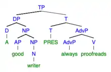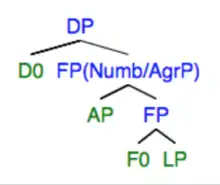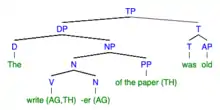 Alexiadou (2001) adopts a structural approach to accounting for eventative versus non-eventative interpretations of deverbal nominalization.[14] Her analysis posits that both interpretations (process nouns and result nouns) are associated with a distinct syntactic structure.[15] Alexiadou (2001) proposes that the functional structure of process nominals are much like verbs in that it includes verb-like projections such as Aspect Phrase (AspP) and a light Voice Phrase (vP), whereas result nominals differ from verbs and have no Aspect Phrase or light Voice Phrase included in its functional structure therefore resembling the structure of an underived noun.[15]