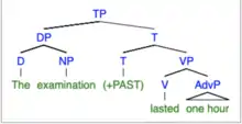 The second instance of examination has a simple event interpretation, because while it is a derived nominal, according to Grimshaw, it does not "inherit" the verbal argument structure, only the lexical/semantic content is projected.[14] The suffix, -ation, is attached to a verb, "examine". The interpretation of the sentence, "The examination lasted one hour", is "The exam took one hour".