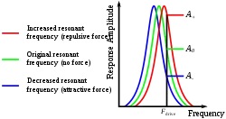 Amplitude modulation was one of the original modes of operation introduced by Binnig and Quate in their seminal 1986 AFM paper,[5] in this mode the sensor is excited just off resonance. By exciting the sensor just above its resonant frequency, it is possible to detect forces which change the resonant frequency by monitoring the amplitude of oscillation. An attractive force on the probe causes a decrease in the sensors resonant frequency, thus the driving frequency is further from resonance and the amplitude decreases, the opposite is true for a repulsive force. The microscopes control electronics can then use amplitude as the SPM reference channel, either in feedback mode, or it can be recorded directly in constant height mode.
