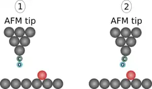 During the pick-up, the CO molecule orients itself such that the carbon atom attaches to the metal probe tip.[38] [39] The CO molecule, due to its linear structure, can bend while experiencing varying forces during the scanning, as shown in the figure. This bending appears to be a major cause for the contrast improvement,[34][36] although it is not a general requirement for atomic resolution for different tip terminations such as a single oxygen atom, which exhibits negligible bending.[40] Additionally, the bending of the CO molecule adds its contribution to the images, which may cause bond-like features in locations where no bonds exist.[36][41] Thus, one should be careful while interpreting the physical meaning of the image obtained with a bending tip molecule such as CO.