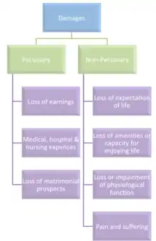 In a personal injury lawsuit in common law jurisdictions, the two basic forms of compensatory damages that may be awarded are economic damages, compensation for the injured person's past and future financial costs and losses, and non-economic damages, compensation for the pain and suffering that results from an injury.[13] As many jurisdictions lack adequate approaches to assessing the worth of unpaid labour or harm to minors and retirees who do not work, non-economic damages are often used as a practical way to ensure that such individuals receive compensation comparable to that received by working adults.[14]