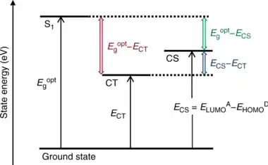 The mechanism of current induction in organic solar cells involves a charge transfer. After electromagnetic absorption and exciton formation in the electron donor polymer, the excited electron is moved towards the acceptor conduction band (LUMO) as a result of the lower energy value than the donor LUMO. This process is called a charge separation, and the corresponding energy value satisfies where CS denotes charge separation, A denotes the acceptor and D denotes the donor molecule. Along with the Coulombic potential that needs to be surpassed, the maximum energy obtained from the process is defined as the Charge Transfer energy, . The difference between the optical excitation energy (the optical band gap energy, ) and the charge transfer energy is the driving force of the system.[8]