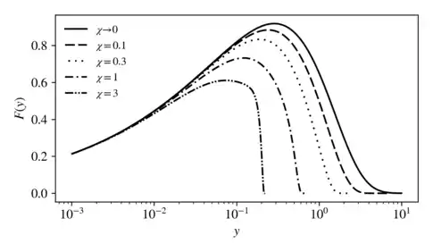 - Inclusion of the discretization of the emitted radiation, i.e. the introduction of photons with respect to the continuous description of the classical limit.[2] This effect does not change quantitatively the emission features but changes how the emitted radiation is interpreted.[2] A parameter equivalent to can be introduced for the photon of frequency and it is called photon quantum parameter:[23][5]where is the photon four-wavevector and is the three-dimensional wavevector. In the limit in which the particle approaches the speed of light, the ratio between and is equal to:From the Frequency distribution of radiated energy one can get a rate of high-energy photon emission distributed in as a function of and but still valid in the classical limit:[32]