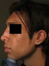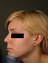 Non-surgical rhinoplasty is a medical aesthetic procedure in which injectable fillers, most commonly hyaluronic acid ones like Restylane and Juvederm or calcium hydroxyapatite (Radiesse), are used to alter and shape a person's nose without a surgery.[1][2] The procedure fills in depressed areas on the nose, lifting the angle of the tip or smoothing the appearance of bumps on the bridge.[3] Non surgical rhinoplasty is an augmentation procedure, so it cannot reduce the size of someone's nose. The cosmetic procedure carries the risk of causing serious skin damage or distant complications like blindness. If the filler product is injected into an artery, filler can travel in the arteries and blocks smaller size arteries like ophthalmic artery and cause blindness. If blood vessels of the skin is blocked, skin necrosis can develop. Hyaluronic acid based fillers can be reversed even if injected into a blood vessel with an enzyme called hyaluronidase, which can be also injected like fillers.