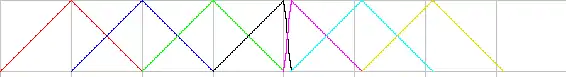 The figures show the linear and the quadratic basis functions for the knots {..., 0, 1, 2, 3, 4, 4.1, 5.1, 6.1, 7.1, ...}