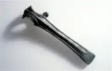 The examination of metal composition in the formation of different types [17][18] does add knowledge concerning production modes. The thicker the object is, the more lead was deliberately added to the cast. The highest amounts of lead were measured in the duckbill axes, less in the flat socketed axes, and much less in thinner blades like spears and daggers, which were much more worked and annealed after being cast. This observation corresponds well with the controlled alloying of the duckbill axes and ribbed daggers (with much less lead in the latter) from the MBIIa, but does not correspond with the spears. Although they are derived mainly from MBIIa contexts, their composition is less controlled and more varied. There might be a connection between the level of allowing control and the investment in the cast — the more complex types, like duckbill and flat socketed axes and ribbed daggers, are usually cast in steatite, two-piece closed and well-carved moulds.[17] On the other hand, some of the less controlled alloyed types, like spearheads and knives as well as more simple tools such as chisel points, were mainly cast into open, relatively roughly carved limestone moulds.