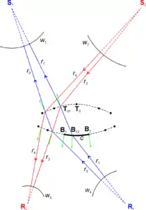 SMS optics are also calculated by applying a constant optical path length between wavefronts. Figure "SMS chain" on the right illustrates how these optics are calculated. In general, the rays perpendicular to incoming wavefront w1 will be coupled to outgoing wavefront w4 and the rays perpendicular to incoming wavefront w2 will be coupled to outgoing wavefront w3 and these wavefronts may be any shape. However, for the sake of simplicity, this figure shows a particular case or circular wavefronts. This example shows a lens of a given refractive index n designed for a source S1S2 and a receiver R1R2.