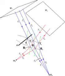 The OPL is constant between wavefronts.[1] This can be seen for refraction in the figure "constant OPL" to the right. It shows a separation c(τ) between two media of refractive indices n1 and n2, where c(τ) is described by a parametric equation with parameter τ. Also shown are a set of rays perpendicular to wavefront w1 and traveling in the medium of refractive index n1. These rays refract at c(τ) into the medium of refractive index n2 in directions perpendicular to wavefront w2. Ray rA crosses c at point c(τA) and, therefore, ray rA is identified by parameter τA on c. Likewise, ray rB is identified by parameter τB on c. Ray rA has optical path length S(τA) = n1d5 + n2d6. Also, ray rB has optical path length S(τB) = n1d7 + n2d8. The difference in optical path length for rays rA and rB is given by: