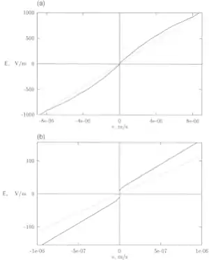 For electrophoresis of colloid particles under a small strength electric field, the force in the right-hand side of Eq. (5) is linearly proportional to the strength of the electric field applied. For a high strength, the linearity is broken due to nonlinear polarization. As a result, the force may depend nonlinearly on the applied field:
