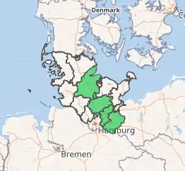 listen); Danish: Nordfrisland, English: North Frisia, North Frisian: Nordfraschlönj) is the northernmost district of Germany, part of the state of Schleswig-Holstein. It includes almost all of traditional North Frisia along with adjacent areas to the east and south and is bound by (from the east and clockwise) the districts of Schleswig-Flensburg and Dithmarschen, the North Sea and the Danish county of South Jutland. The district is called Kreis Nordfriesland in German, Kreis Noordfreesland in Low German, Kris Nordfraschlönj in Mooring North Frisian, Kreis Nuurdfresklun in Fering North Frisian and Nordfrislands amt in Danish.