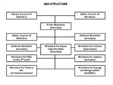 On the political level, co-operation in the NB8 format is conducted primarily in the form of annual meetings of the Prime Ministers and Foreign Ministers. The Foreign Ministers' meetings have taken place since 1993. In addition to the foreign ministers and prime ministers, other ministers and ministry officials also meet on a regular basis. In the realm of foreign policy, there are many meetings held in addition to the annual meeting of the foreign ministers. The secretaries general, political directors, and experts in various fields from the foreign ministries also get together regularly, and there are frequent meetings of diplomats in foreign representations within the NB8 format.[14]