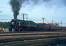 From late 1944 to early 1945, one of the Js, No. 610 was on loan to the Pennsylvania Railroad (PRR), where it was tested to haul 15 passenger cars at more than 110 mph (177 km/h) over the flat terrain on the Fort Wayne Division between Crestline, Ohio and Chicago, Illinois.[9][10] Because of their power and speed, the class Js were among the most reliable steam locomotives as they run evenly on the mountainous and relatively short route of the N&W.[3] They, along with the articulated 2-6-6-4 class A and 2-8-8-2 Y6 freight locomotives, were part of N&W's "Big Three" steam locomotives and represented the pinnacle of steam locomotive technology.[1][11]