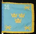 The unit standard was presented to the then Royal Luleå Anti-Aircraft Corps (Lv 7) in Luleå by the commander of the VI Military District, Major General Nils Roslund in 1943.[11] It was used as unit standard by Lv 7 until 1 July 2000. The standard is drawn by Brita Grep and embroidered by hand in insertion technique by the Kedja studio, Heraldica. Blazon: "On blue cloth in the centre the lesser coat of arms of Sweden, three open yellow crowns placed two and one. In the first corner the town badge of Luleå; two white keys, the left inverted (the original name of the battalion was Luleå Anti-Aircraft Corps). In the other corners two winged yellow gunbarrels of older pattern in saltire. Yellow fringe."[11]