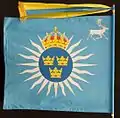 The colour was presented to the then Norrland Logistic Regiment (T 3) at the Artillery Yard in Stockholm by the Chief of Army Staff, lieutenant general Åke Sagrén on 21 October 1995.[8] It was used as regimental colour by T 3 until 1 June 2000. The colour is drawn by Ingrid Lamby and embroidered by machine in insertion technique by the Engelbrektsson Flag factory. Blazon: "On light blue cloth in the middle, on a circular shield, the lesser coat of arms of Sweden according to the law, the shield surrounded by white tongues and rays. In the first corner the reindeer of the provincial badge of Västerbotten; white with red arms."[8]