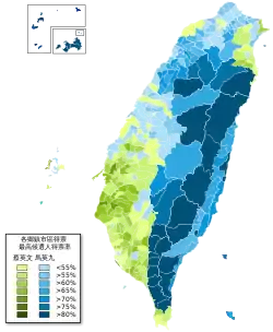 The data of historical elections show a divide between urban versus rural voters, and northern versus southern Taiwanese.[87][88] For instance, voters from municipalities in northern Taipei were more inclined to support same-sex marriage legalization. Among the top ten cities in favor of same-sex marriage were the far northern cities of Taipei, New Taipei, Hsinchu, and Keelung.[88]