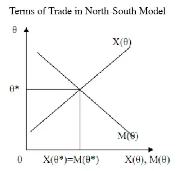 To determine equilibrium, we need only to look at the market for one of the goods, as per Walras' law. We consider the market for the South's goods: primary products. The demand for imports, M, from the South is a positive function of per capita consumption in the North and a negative function of the terms of trade, , (higher means relative price of primary products is high and less will be demanded). The supply side comes from export of primary products by the South, X, and is a positive function of the terms of trade and the South's aggregate consumption of primary products.