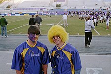 Members of the UNA Lion Pride spirit team sporting the traditional school colors, purple and gold. The team, begun in 2007, is charged with generating school spirit not only on the athletic field but also on campus.