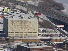 During the 1960s the Albany municipal landfill was located on the site of a former river water filtration plant that operated from the early 20th century to the 1930s. While the tanks are assumed to have been demolished, several structures associated with the plant are still buried under the trash, such as concrete foundations and tunnel structures.[27] Located along Erie Boulevard on approximately 45 acres (18 ha) between Interstate 787 (I-787), Interstate 90 (I-90), Erie Boulevard, and the Albany County Wastewater Treatment Plant, it was closed to municipal waste in 1969 in favor of a new landfill in the Albany Pine Bush area in the western section of the city.[27][28] The landfill continued to operate as the North Albany Demolition Landfill, for demolition/construction debris until 1988.[29] The city's Department of Public Works garage was built on a part of the landfill,[30] with land near by used for the creation of the 92,000 square feet (8,500 m2) Erie Boulevard Commerce Park on 16.6 acres (6.7 ha).[31] Original plans were for Erie Boulevard, which was built on top of the old Erie Canal, to be extended through to Menands to Exit 6 of I-787.[31][32] Though Albany would have borne all the costs of construction Menands still refused.[32] Erie Boulevard was subsequently built to the border and no further in 1988 as part of the park construction.[31][33]