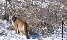 A 2012 study using 18 motion-sensitive cameras in Río Los Cipreses National Reserve counted a population of two males and two females (one of them with at least two cubs) in an area of 600 km2 (0.63 cougars per 100 km2).[27] The Bay Area Puma Project aims to obtain information on cougar populations in the San Francisco Bay area and the animals' interactions with habitat, prey, humans, and residential communities.[28] A study on wildlife ecologists showed that urban cougar populations exist around the Los Angeles metropolitan area, with individuals of these populations having the smallest home ranges recorded for any cougars studied, and being primarily nocturnal and not crepuscular (most likely adaptations to avoid humans in high-density areas).[29]