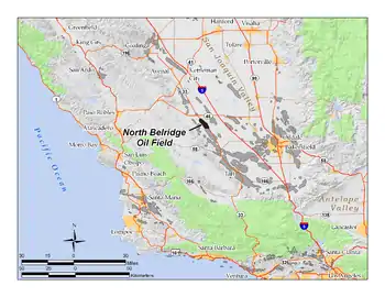 The North Belridge Oil Field is a large oil field along California State Route 33 in the northwestern portion of Kern County, California, about 45 miles west of Bakersfield. It is contiguous with the larger South Belridge Oil Field to the southeast, in a region of highly productive and mature fields. Discovered in 1912, it has had a cumulative production of 136,553,000 barrels (21,710,200 m3) of oil, and retains 27,443,000 barrels (4,363,100 m3) in reserve, as of the end of 2006, making it the 40th largest oil field in the state.[1]
