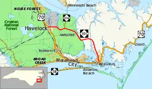 NC 101 begins at a traffic light along US 70 in Havelock. NC 101 continues east from US 70 along Fontana Boulevard south of the Cherry Point Military Base. As NC 101 continues eastward it passes farms and forest along the routing. NC 101 meets up with the southern terminus of NC 306 south of the Minnesott Beach Ferry. At this point, the highway becomes concurrent with North Carolina Bicycle Route 7.[3] NC 101 continues three miles (4.8 km) to the east before reaching North Harlowe at the edge of the Croatan National Forest. NC 101 then turns south to cross into Carteret County. After three more miles NC 101 enters the town of Harlowe. NC 101 turns eastward and leaves the Croatan National Forest before crossing the Intracoastal Waterway near Core Point.[1][4]