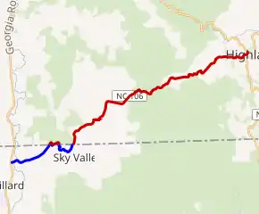 SR 246 begins at the intersection of US 23/US 441/SR 15, in Dillard, Georgia. As it enters North Carolina for the first time, the road widens to improve staying in the curves, with the north-east side becoming two lanes. During the third incursion in Georgia, there is an overlook with a clear view toward the west of the town of Dillard. The overlook is above Estatoah Falls but can not be seen. The falls are on private property and cannot be accessed. They can be seen only at a distance from Hwy 246 heading from Dillard to Sky Valley. By the final border crossing the highway will merge back into two-lanes. Continuing north in North Carolina, several roads near the border connect back into Georgia to the mountain resort area of Sky Valley. Passing through the community of Scaly Mountain, the highway ends at US 64/NC 28, in Highlands.[3]