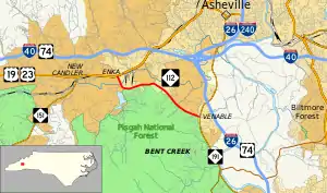 NC 112 begins at its western end at US 19/US 23 (Smokey Park Highway) in the unincorporated community of Enka, but within the city limits of Asheville.[2][3] From here it travels south and then east on Sand Hill Road before turning southeasterly on Sardis Road then ending at North Carolina Highway 191 (Brevard Road) in the Asheville community of Venable. Though both ends are within the city limits, short portions of the road exit the city. Throughout most of the length, the Pisgah National Forest's border is located on the south side of the road.[3]